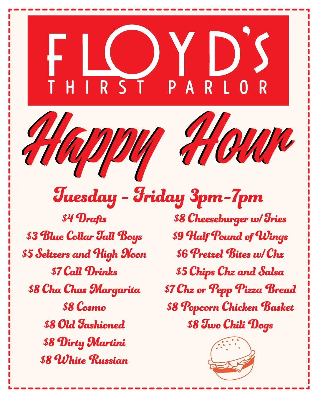 Since that change, we have made it our goal to refine the "Swiss-army-knife" appeal of Floyd's while maintaining its comfortable, classic tavern atmosphere. While we don't feature as extensive a beer list as some, we feel our curated selection rivals those twice its size. Andrew kept the cocktail program alive with regularly changing cocktail menus that offer exciting originals and and pay homage to the classics.
